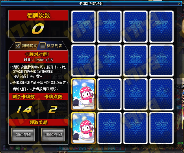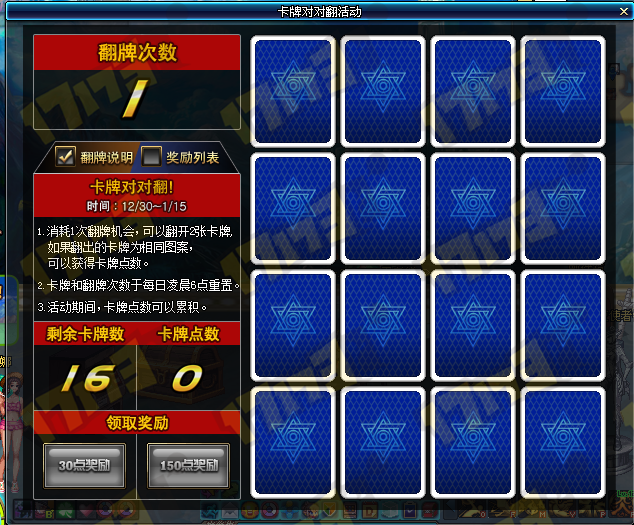 每天登陆可获得1次翻牌次数,每通关2次推荐地下城可获得1次翻牌次数,对对翻小游戏,每翻开2张相同的牌,即可获得2点卡牌点数,成功翻牌所有牌时可额外获得20点点数(每日最高可获得36点点数)