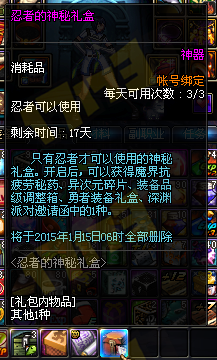 忍者神秘礼盒,全职业刷图可掉落账号绑定的忍者神秘礼盒,忍者可使用,每日最多可使用3次
