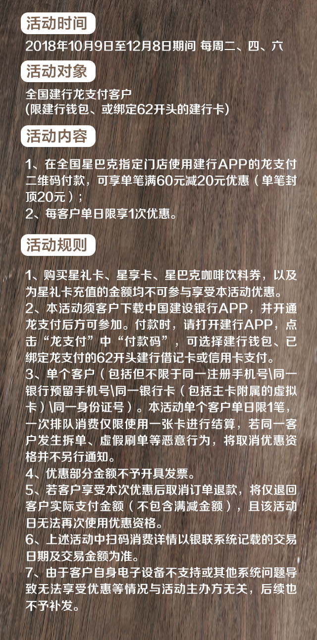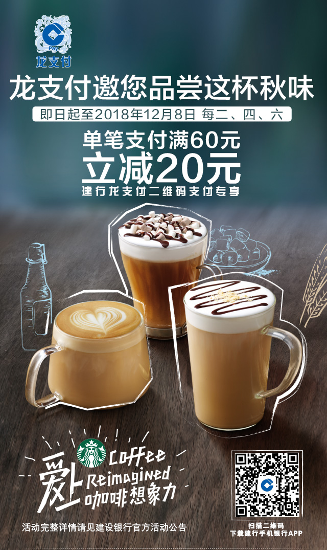 每周二、四、六,在全国星巴克指定门店使用建行APP龙支付二维码付款,单笔满60立减20元,每天可享受1次优惠
