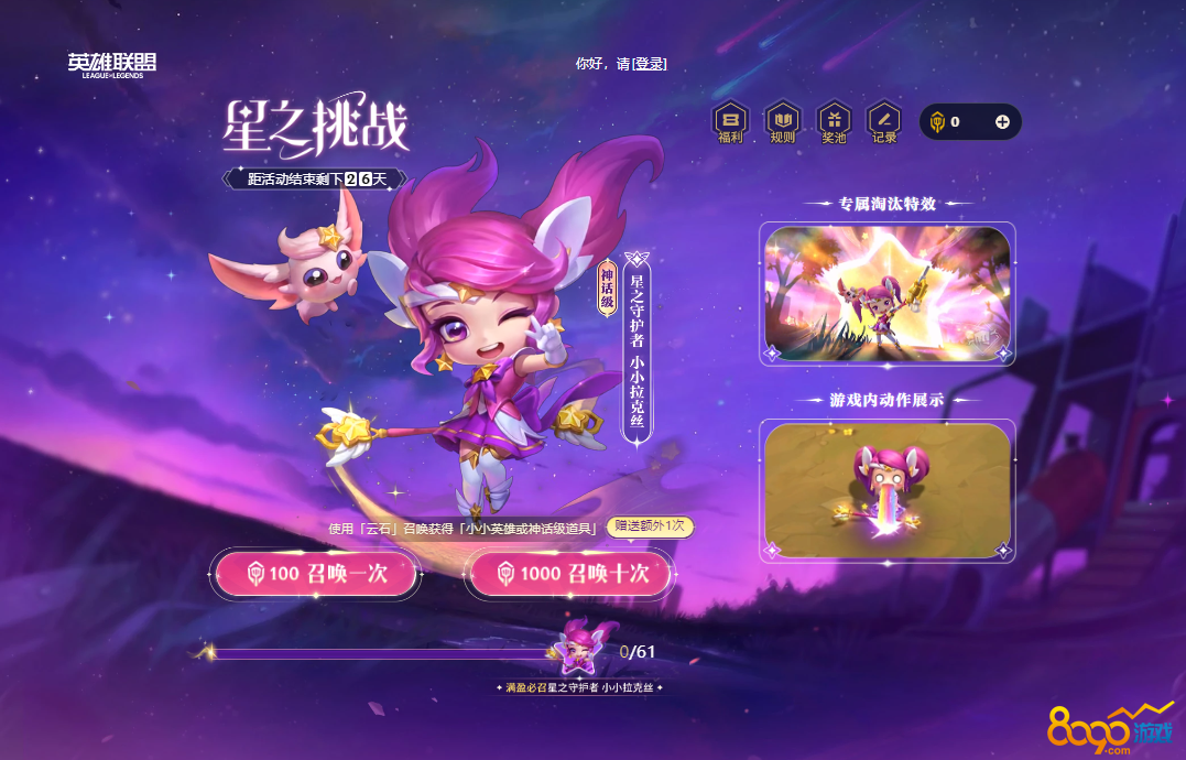 云顶之弈星之挑战 抽星之守护者小小拉克丝等,参与星之挑战活动,有机会解锁【星之守护者 小小拉克丝】,消耗100云石可召唤随机小小英雄。如果玩家未拥有小小拉克丝,将会在第61次召唤或之前解锁【星之守护者 小小拉克丝】。
