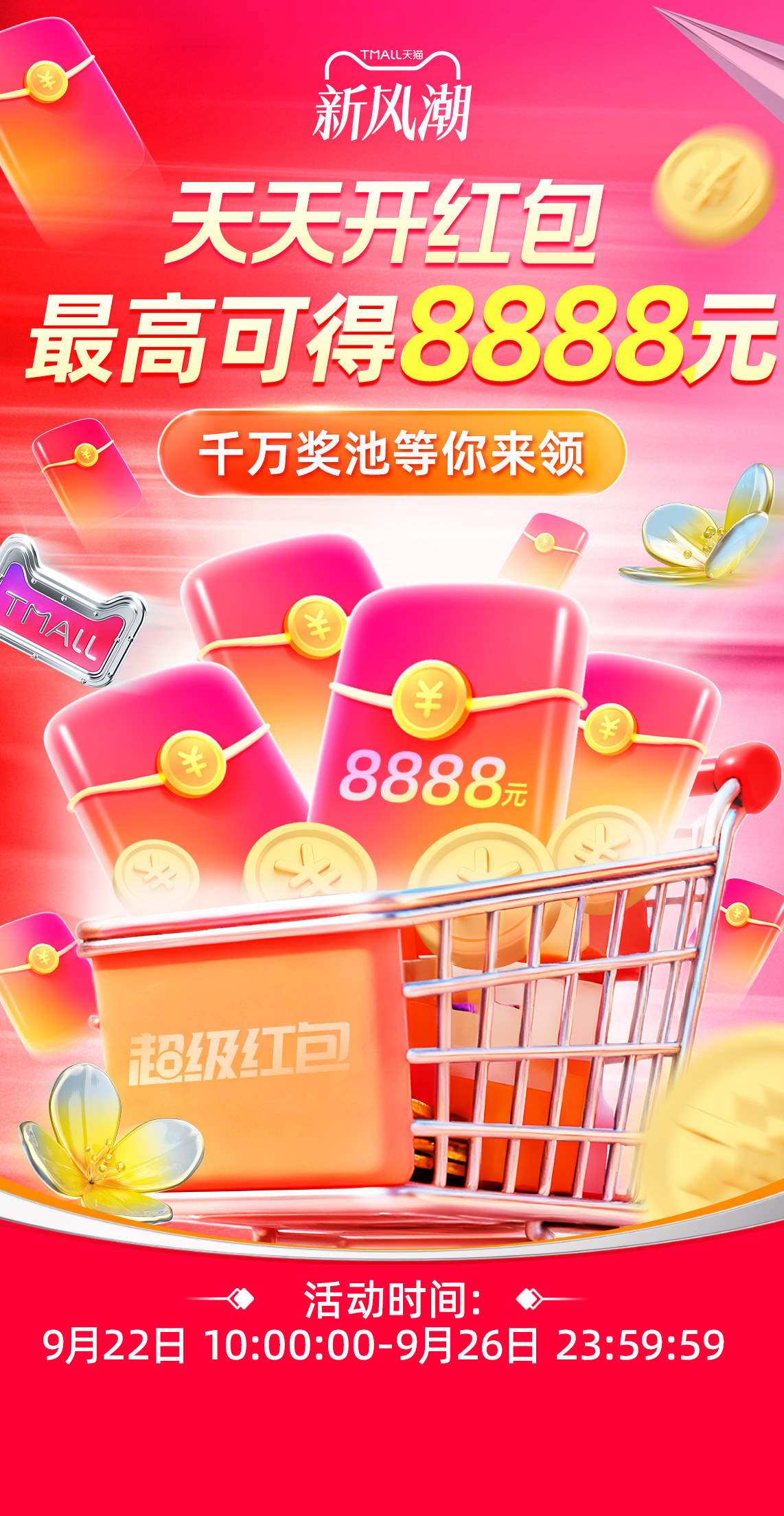 淘宝新风潮每天领无门槛红包 最高8888元,都可以去参与下。