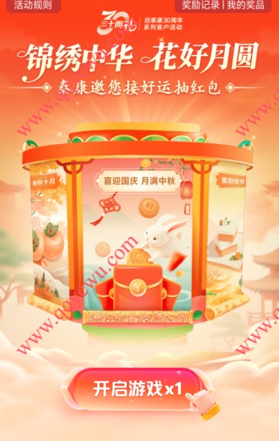 泰康人寿锦绣中华花好月圆抽0.3-300元微信红包,玩小游戏达到20分可抽奖,可中多次奖。