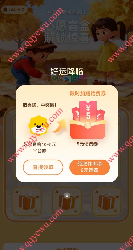 打开中国联通APP搜索【权益超市】进去点左中侧滚动图片【心愿盲盒,解锁惊喜】进入参与。