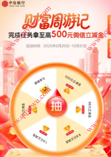中信银行财富周游记抽1-500元微信立减金