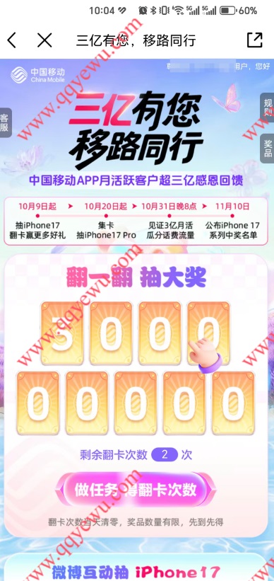 移动三亿有您翻牌抽1-666元话费,流量日包等,简单完成任务翻牌抽奖。