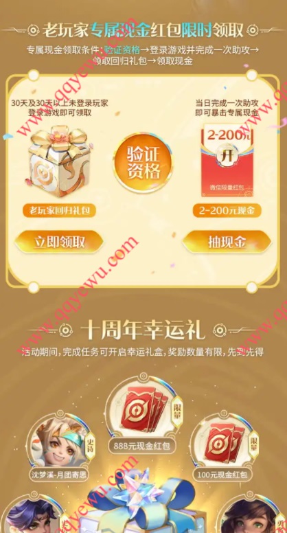 王者荣耀10周年回归用户领2-200元微信红包,打开活动验证资格然后领取即可。