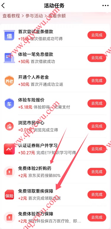打开京东金融APP我的--余额--天天赚现金下面的【查看更多】进入后下拉找到【免费体验2折购药】和【免费领取重疾保障】完成后领取(要手动领,如领取失败就重新领或过会再领)