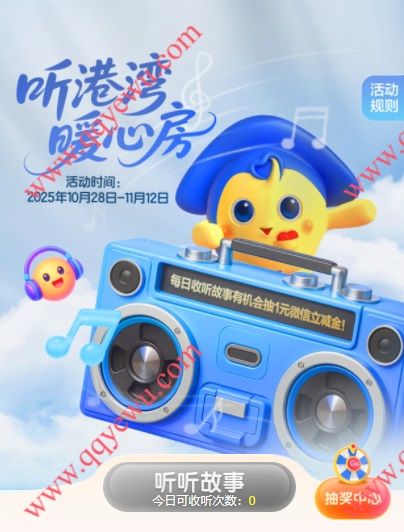建行劳动者港湾暖心房抽6.6万份微信立减金,每天听3次故事可以抽奖3次,每天都可以去
