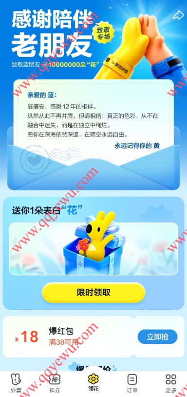 打开美团APP首页【外卖】底部中间【领花】参与。