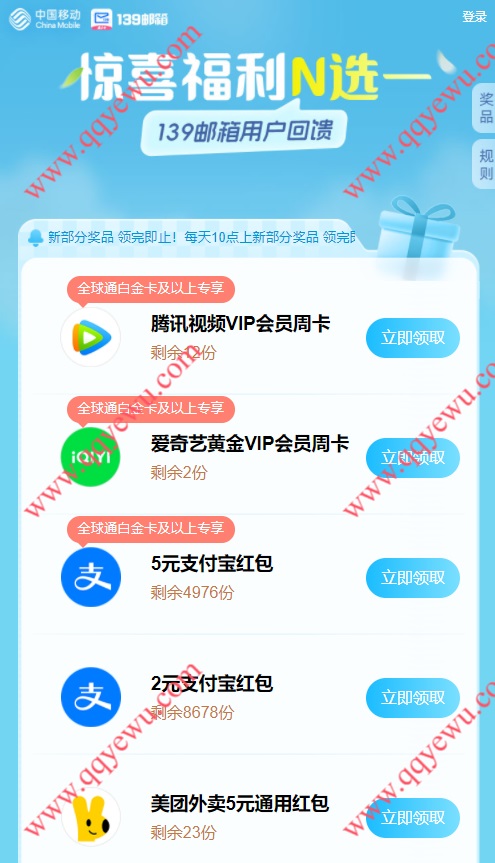 移动139邮箱惊喜福利领2-5元支付宝红包 腾讯爱奇艺会员等,登陆后直接领,如果领完了就晚一点再去或者第二天再去,每天不定时补充库存