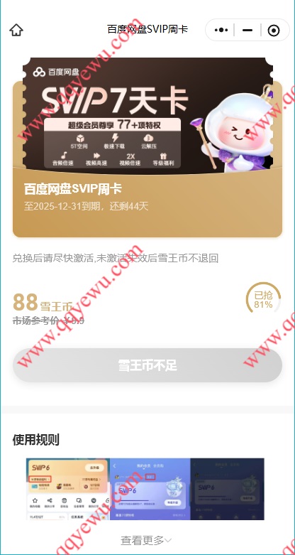 蜜雪冰城88雪王币兑换百度网盘SVIP周卡,雪王币多的可以去兑换。