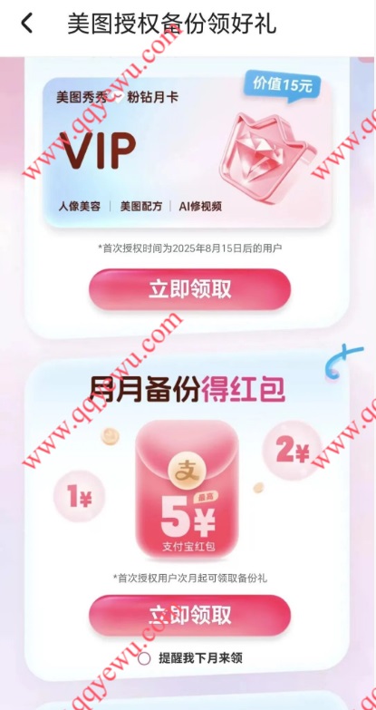 美图粉钻VIP限时免费送+备份得1-5元现金