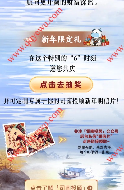 南方基金司南投顾6周年抽2万个微信红包,打开活动首页中间滚动图片【时光为河司南为舟20000个红包】进入下拉到底点【点击去抽奖】参与,需要在卡券里手动提现
