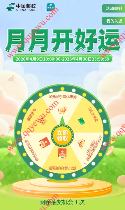 邮生活月月开好运抽微信立减金,邮乐网优惠券等,都可以去参与下。