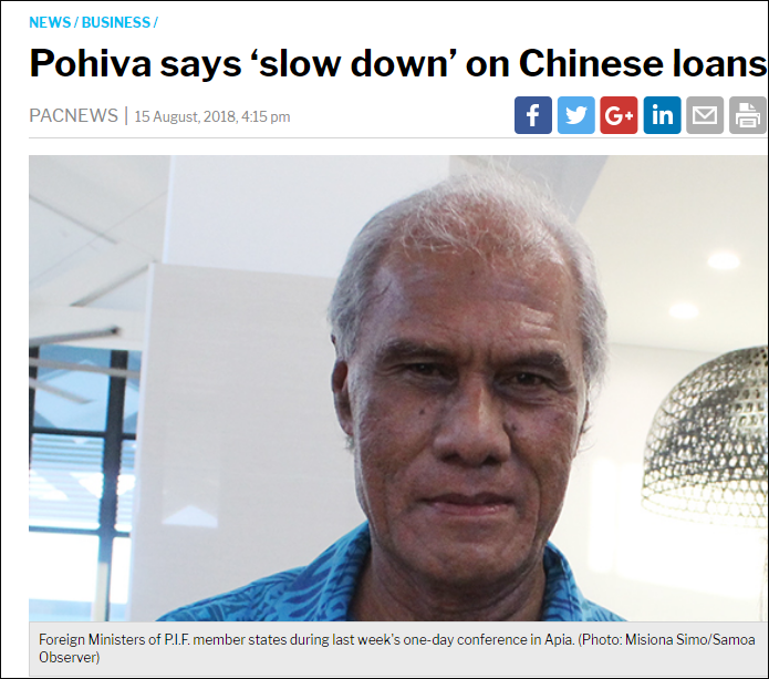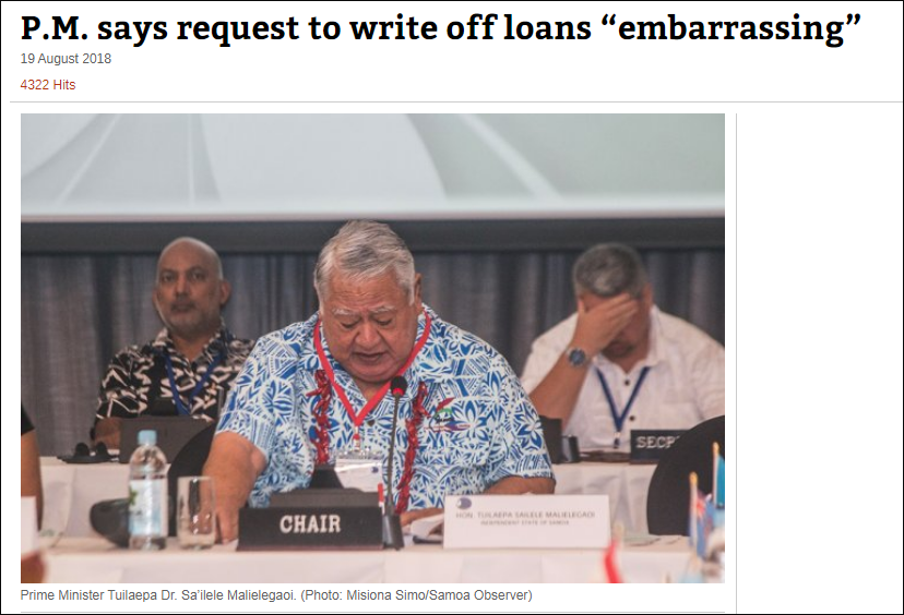 汤加首相波希瓦(Akalisi Pohiva)因债台高筑、无力偿还,便公开呼吁太平洋岛国要联合起来,要求中国免除它们所拖欠的贷款债务。但该要求立即遭到萨摩亚总理图伊拉埃帕(Tuilaepa)的拒绝。