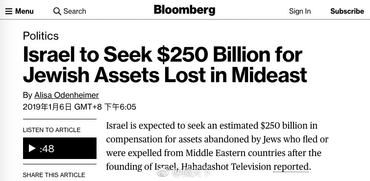 以色列预计向八个中东国家索赔共2500亿美元,因以色列建国后,犹太人在这些国家遭驱逐或被迫逃亡,导致财产损失。