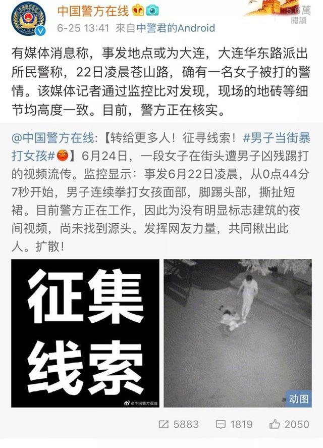刚刚,@大连公安发布通报称,近日网传“女子半夜遭到殴打”视频,经我市警方核实,系2019年6月22日凌晨1时许,发生在甘井子公安分局华东路派出所辖区的一起警情。