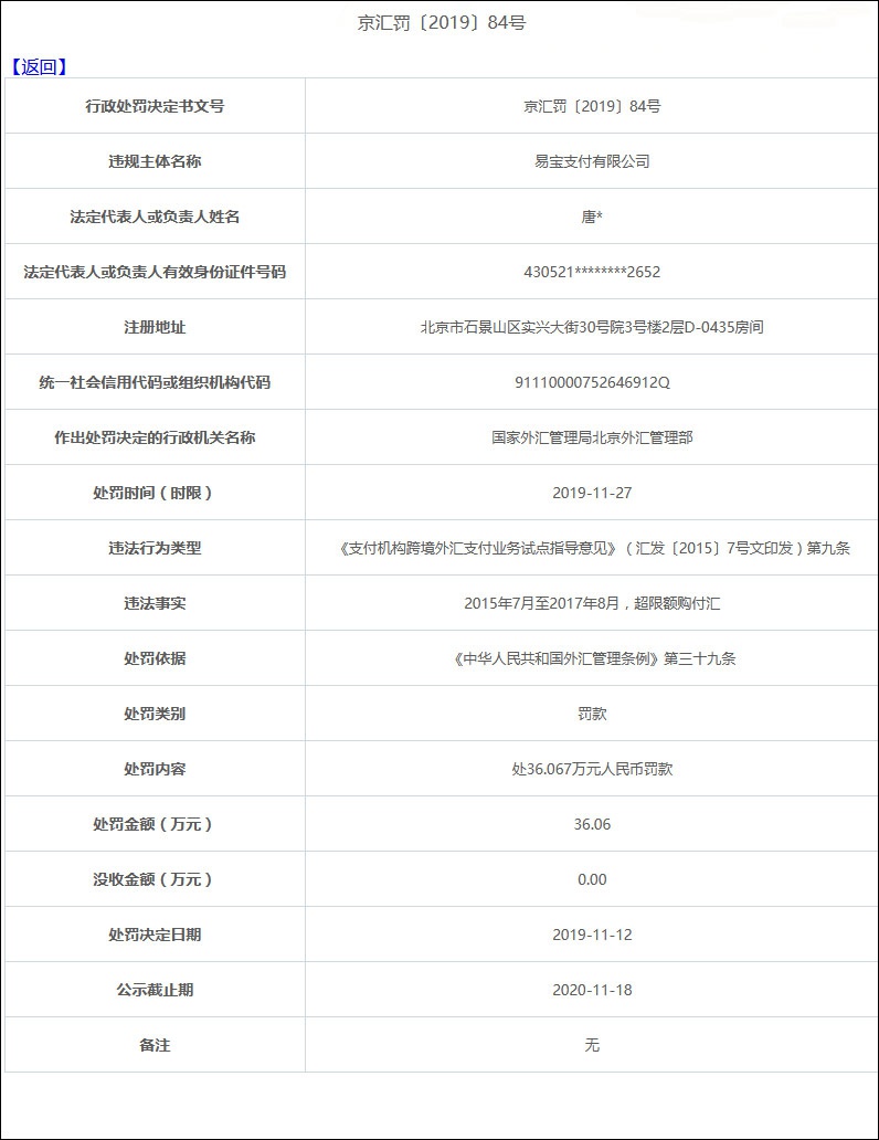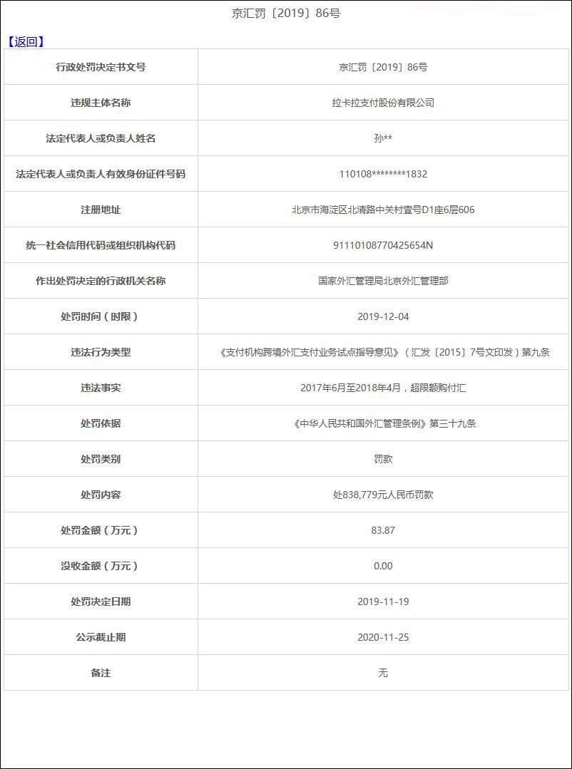 罚单信息显示,拉卡拉因2017年6月至2018年4月超限额购付汇,被处以罚款83.87万元;易宝支付因2015年7月至2017年8月超限额购付汇,被处以罚款36.06万元。处罚依据皆为《中华人民共和国外汇管理条例》第三十九条。