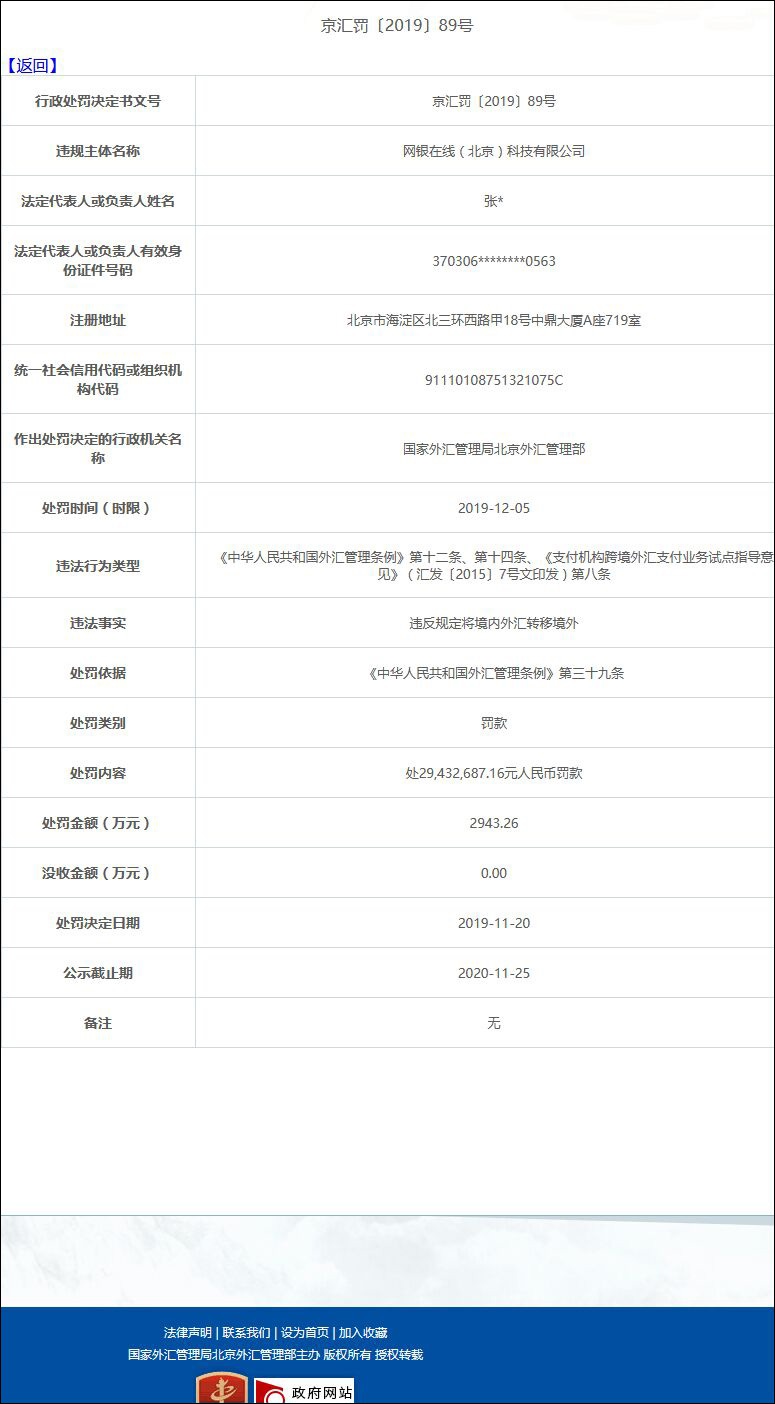 11月26日,国家外汇管理局网站公示了对网银在线(北京)科技有限公司(下称:网银在线)的行政处罚决定。该公司因违反规定将境内外汇转移境外,被罚2943.26万元。