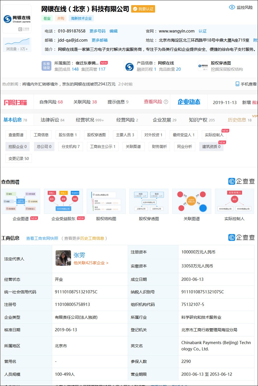 企查查信息显示,该支付公司注册资本10亿元,法定代表人张?。2012年10月京东收购网银在线,当时法定代表人变更为刘强东。