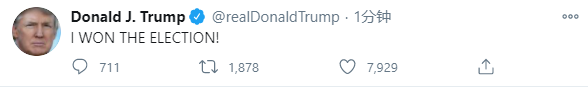 随后,他的这条推文被推特官方贴上标签“与官方消息源对这场选举判定的结果不同”。