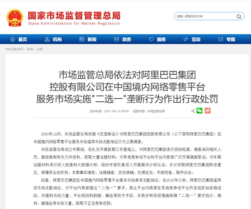 2021年4月10日,针对阿里巴巴涉嫌“实施滥用市场支配地位行为”一案,市场监管总局发布了《国家市场监督管理总局行政处罚决定书》,其判罚结果包括停止“二选一”行为和182.28亿元罚款。