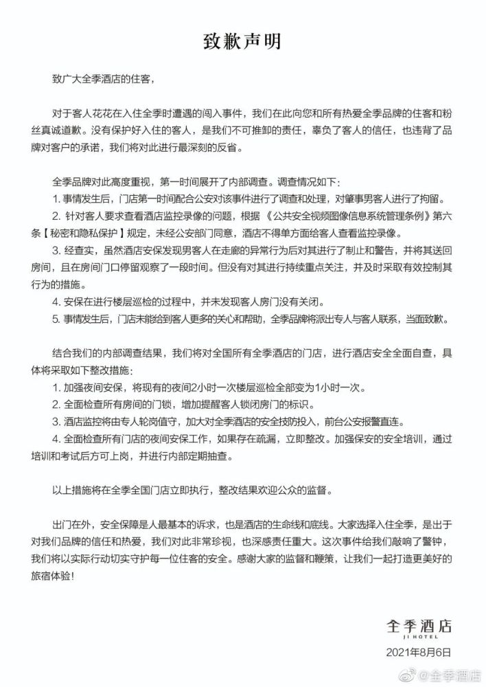 8月6日,全季酒店发布致歉声明,全季品牌对此高度重视,第一时间展开了内部调查,并结合内部调查结果,将对全国所有全季酒店的门店,进行酒店安全全面自查,具体整改措施包括:加强夜间安保,将现有的夜间2小时一次楼层巡检全部变为1小时一次;全面检查所有房间的门锁,增加提醒客人锁闭房门的标识。