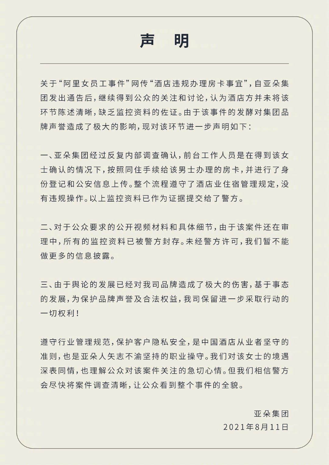【#亚朵酒店再发布声明#:办房卡经阿里女员工确认,监控资料已给警方】“阿里女员工事件”事发酒店济南西站国际会展中心亚朵轻居酒店所在亚朵集团8月11通过其官方微博@亚朵ATOUR 再次发布《声明》,回应“酒店是否存在违规办理房卡问题”。其声明称:前台工作人员是在得到该女士确认的情况下,按照同住手续给该男士办理的房卡,并进行了身份登记和公安信息上传。