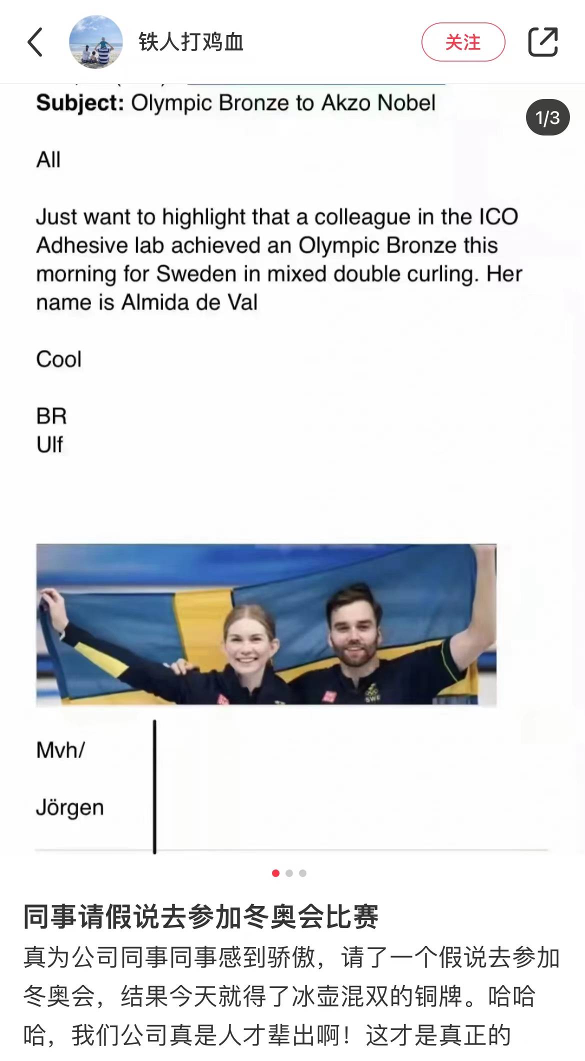 北京时间2月11日消息,一位上海网友爆料自己公司的瑞典同事请假参加了北京冬奥会的冰壶比赛,并且拿到了铜牌,一时间登上热搜引发广泛讨论。