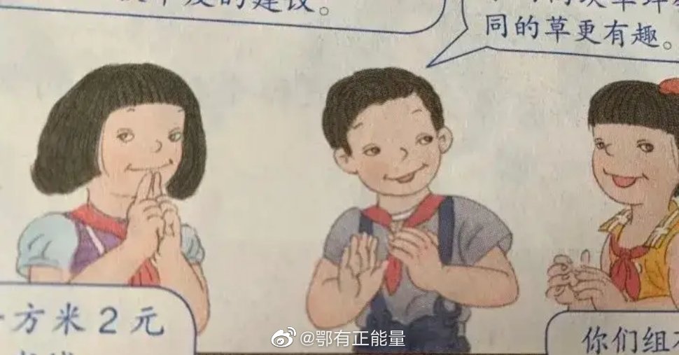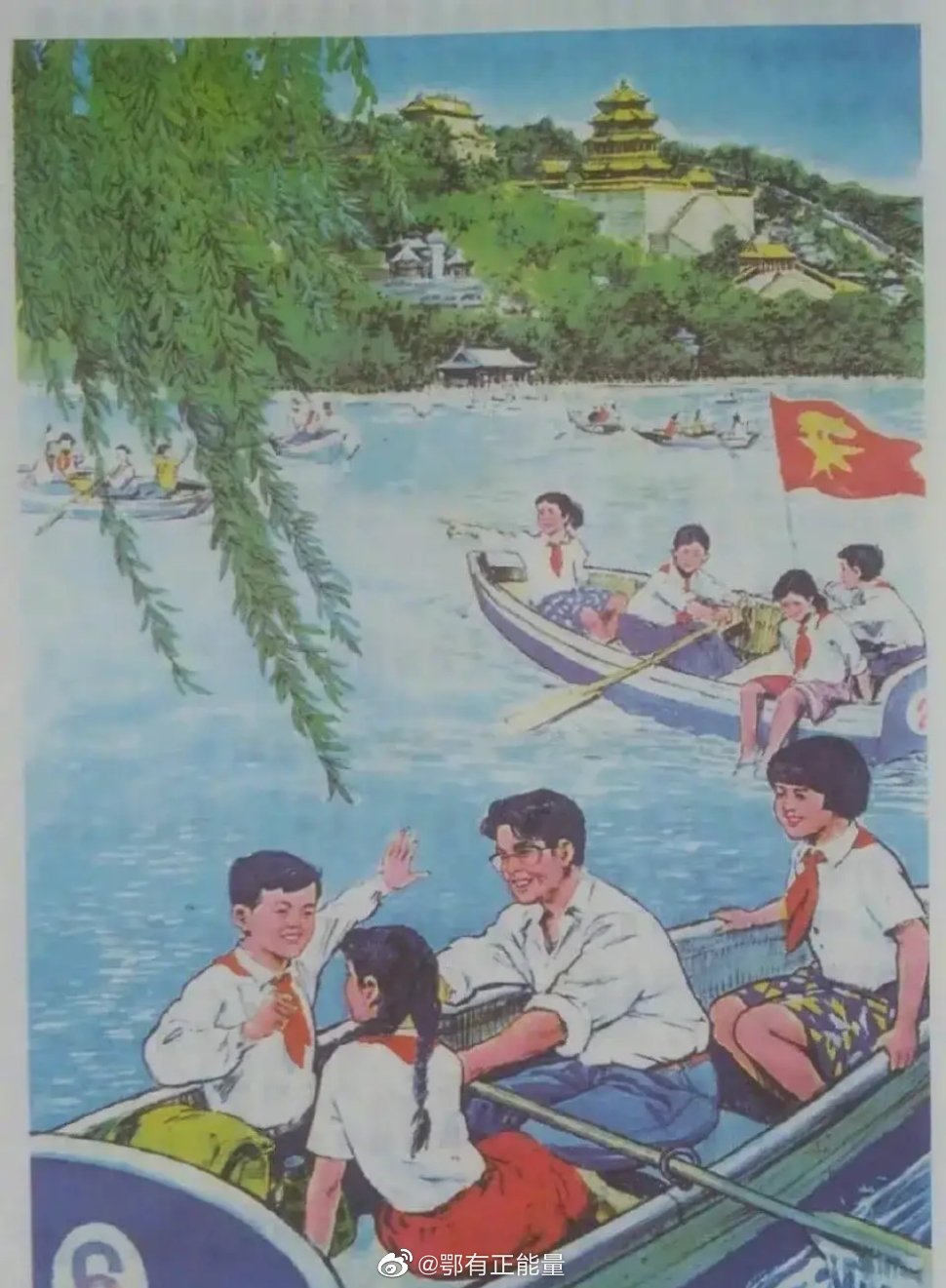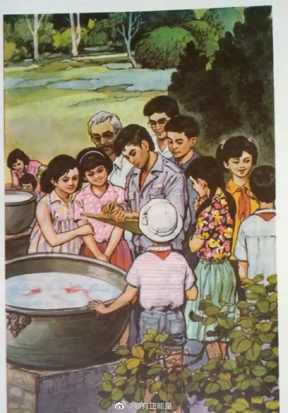 老教材的人物大人小孩都是一脸正气,朝气蓬勃,阳光的样子,还是老一辈画家厉害,手法朴实,情感真挚,画出来了我们向往的生活。