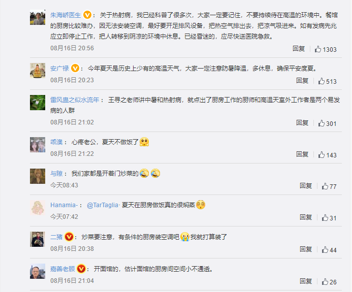 网友评论:厨房炒菜患热射病还真不多见,是不是男子体质比较差,或者时间比较长,通风较差,一般工地上的搬砖人,高温高湿不透气的环境中容易中暑,在急诊经常有中暑的,严重的会要命。