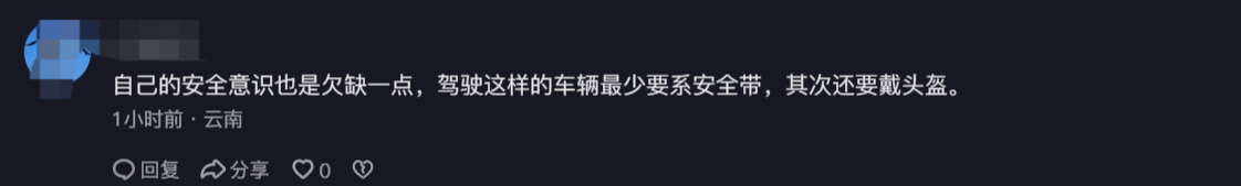 也有网友觉得,其实这次事故中,自己的安全意识也是欠缺一点,驾驶这样的车辆最少要系安全带,其次还要戴头盔,这样才能防患于未然。