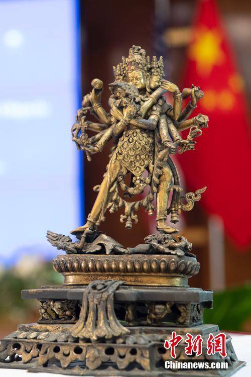 当地时间4月17日,中国文物返还移交仪式在纽约曼哈顿中国驻纽约总领馆举行,美国纽约曼哈顿区检察官办公室将缴获的38件中国流失文物移交中国政府。图为美方返还的铜鎏金胜乐金刚像。中新社记者 廖攀 摄