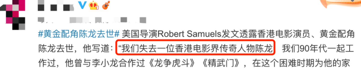 10月10日,外国导演Robert Samuels在个人社交平台上发文透露著名电影演员陈龙去世,享年79岁,他还配文表示“我们失去了一位电影界的传奇人物......在这个困难时期为他的家人祈祷。”