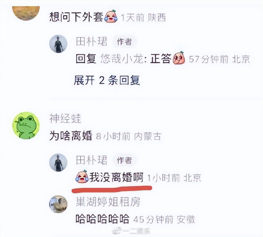 不过,该爆料还是迅速引发网友热议,很快登上热搜。随后,田朴珺在评论区中回应了网友的“关心”:“我没离婚啊”