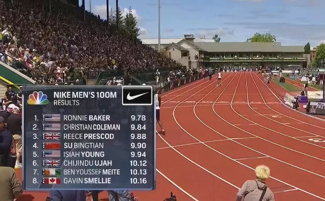 途中跑两位美国选手继续保持领先,贝克则稍微摆脱科尔曼独自在前,苏炳添顽强保持在第三。在杀到临近终点时,普雷斯科德又展现他后发制人的能力,他从第二道猛追,迫近一直排在第三的苏炳添,在最后冲线前,普雷斯科德略微超过了苏炳添!