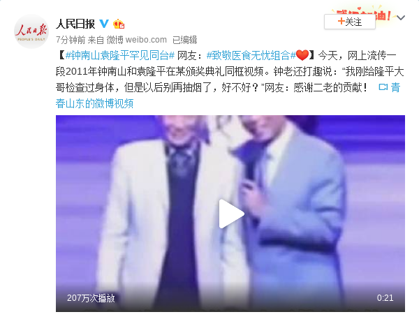 网上流传一段2011年钟南山和袁隆平在某颁奖典礼同框视频。钟老还打趣说:“我刚给隆平大哥检查过身体,但是以后别再抽烟了,好不好?”网友:感谢二老的贡献!