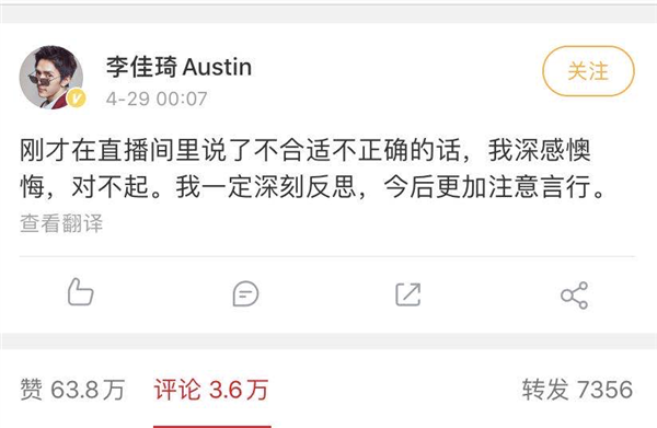 今日凌晨,李佳琪的道歉来了。他在微博称自己说了“不正确”、“不合适”的话,一定深刻反思,今后更加注意言行。