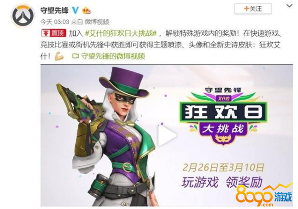 在2月26日至3月10日期间,狂欢日大挑战活动正式开始,在活动期间玩家可以解锁特殊游戏内的奖励,玩家只需要在快速游戏、竞技比赛或者是街机先锋模式中区的胜利那么就可以领取狂欢日大挑战主题的喷漆、头像以及全新史诗皮肤奖励——狂欢艾什,只要取得胜利就可以轻易获得以上奖励哦!