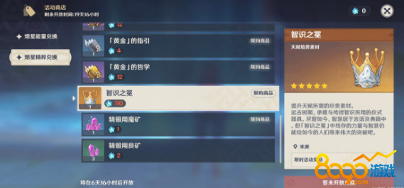 智识之冕天赋9升10必备,而且活动限定获取,建议先换完这个屯着,迟早要用,毕竟10级技能想升就得靠这个了,材料有别的方法获得,这玩意目前只有活动,还没有其他获得这个东西的方式。所以就算是商店里面的所有东西都不换,智识之冕也一定要换。