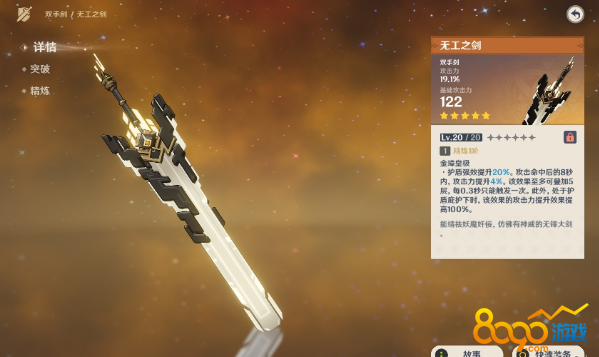无工之剑处于钟离盾下,叠五层加百分之40攻击,八秒一轮,钟离盾20秒可以两轮,这个攻击力加的也太夸张了吧,钟离盾还贼厚,如果玩家的队伍能稳定提供护盾的话,无工之剑给卢姥爷略强于狼末,玩家可以去试下那个加攻击的效果是不是只有套盾才能触发,如果需要那就配一个工具人就行,如果不需要那这把剑就比狼末还好。