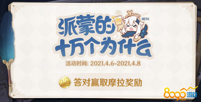 原q神q开y启e了w派蒙的十万个为什么答题活动beta活动,玩家每答对一题,就能获得5000摩拉的奖励,每天可获得10道题的奖励,也就是5W摩拉,活动总共持续3天,可获得15W摩拉奖励,其中有一题问原神水精灵一共可以召唤多少种化形,答案是8种。