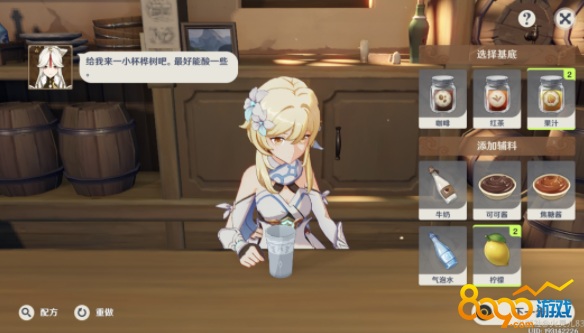 关于凝光的调酒,因为想要酸一点,所以在桦树基础的搭配上多加一份柠檬,北斗的调酒,因为没有特殊要求,所以直接按照暮色的配方来调就行。这个活动可以先按配方把基底调好,然后根据要求多放点东西,比如茶和糖之类的,所以玩家一定要多注意一下每个客人的要求是什么。