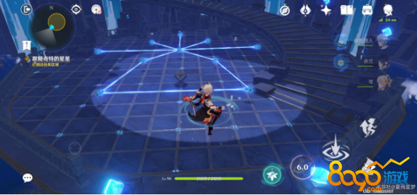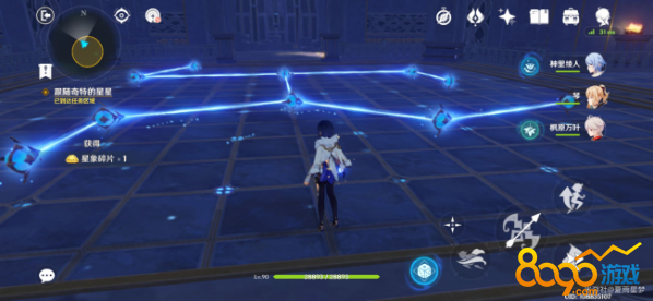 进入大门后,往上面看会发现,有一组符文,将符文复制下来,就可以解开星象谜题。然后你往地上看会发现有一些符文在闪,再复刻下来就会有宝箱。进入第3阶段,你就会跟着一颗星星,然后就是中间水池直接跳进就可以了。追星星的时候注意别走太快了,平台升的很快容易卡住。星空挑战是不要被星星击中就可以挑战成功。