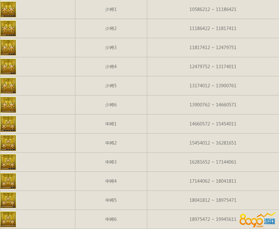 士兵:列兵1(0 ~ 456)、列兵2(457 ~ 912)、三等兵(913 ~ 1824)、二等兵(1825 ~ 3192)、一等兵(3193 ~ 5016)、上等兵1(5017 ~ 7296)、上等兵2(7297 ~ 10032)、上当兵3(10033 ~ 13224)、上等兵4(13225 ~ 17784)