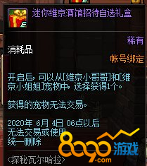 维京酒馆招待自选礼盒是该活动的最高奖励,玩家需要达到50000的活动分数才可以获得这个礼盒,该礼盒中有两个宠物,分别是维京小哥哥和维京小姐姐,这个维京酒馆招待自选礼盒中的宠物是不可以进行交易的,俩个宠物的外观还是非常可爱的,至于具体的属性暂时还不清楚,但是这个礼盒是活动赠送的,那么属性就不会那么完美,所以玩家当做收藏宠物对待就可以了。