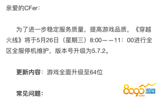 此次停机维护的内容主要是全面升级到64位,版本号升级为5.7.2,此次更新完之后,CF游戏将会根据玩家的系统来匹配对应的游戏客户端,系统64位的电脑,游戏将会自动升级,玩家们无需任何操作,并且64位的客户端也将会为玩家带来更好的游戏体验。