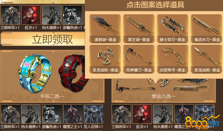 黑金八选一:渡鸦剑-黑金、冥王剑-黑金、骑士双刃-黑金、鬼武长刀-黑金、圣灵战轮-黑金、死神镰刀-黑金、炎阳弯弓-黑金、圣龙战枪-黑金