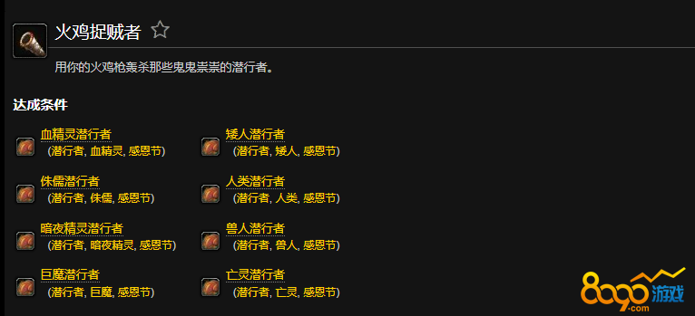 玩家需要用火鸡枪,对10个基础种族的潜行者使用。这个任务其实是非常简单的,就是去找敌对阵营的盗贼不容易,比较难找。火鸡捉贼者这个成就建议玩家和朋友组队去做,轮流创建不同种族的盗贼小号,完成成就的速度还是很快的。