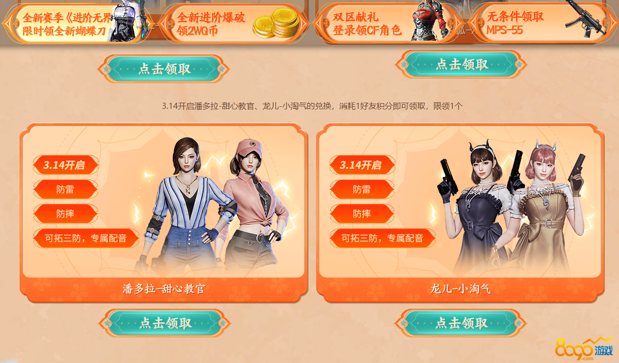 卡通嘉年华活动更新,3.14开启潘多拉-甜心教官、龙儿-小淘气的兑换,消耗1好友积分即可领取,这2个道具限领1个。龙儿小淘气和潘多拉甜心教官都是2+1防角色,玩家消耗属性拓展券是可以拓展成3防的,并且都有专属配音。这2个角色之前的活动都是免费送过的,属性方面,潘多拉甜心教官可以刷的属性会稍微多一点,其余的没有任何区别,所以玩家缺哪个就选哪个。